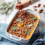 Spread the sweet potato mixture evenly into a greased 9×13-inch baking dish. Now sprinkle the nut and oat crumble on top, and don’t be shy with extra whole pecans and walnuts for more texture. Garnish with fresh sage leaves—it adds a pop of color and an aromatic lift. Drizzle a little olive oil over everything to encourage browning. Bake for about 20 minutes until the topping is beautifully browned and crisp. You’ll know it’s done when it’s crackly on top but still creamy underneath.
