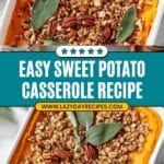This sweet potato casserole pairs beautifully with roasted turkey or chicken—perfect for holiday spreads. I also love it alongside green beans almondine or a crisp mixed green salad with tangy vinaigrette to balance the richness. If you’re serving a cozy fall meal, mashed cauliflower or quinoa pilaf work wonderfully too.