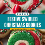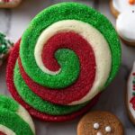 Swirled Christmas Cookies are delightful festive treats featuring soft, tender cookie dough in vibrant red, green, and white spirals adorned with colorful Christmas sprinkles. These visually striking cookies offer a perfect balance of almond and vanilla flavors, ideal for holiday celebrations and gifting.