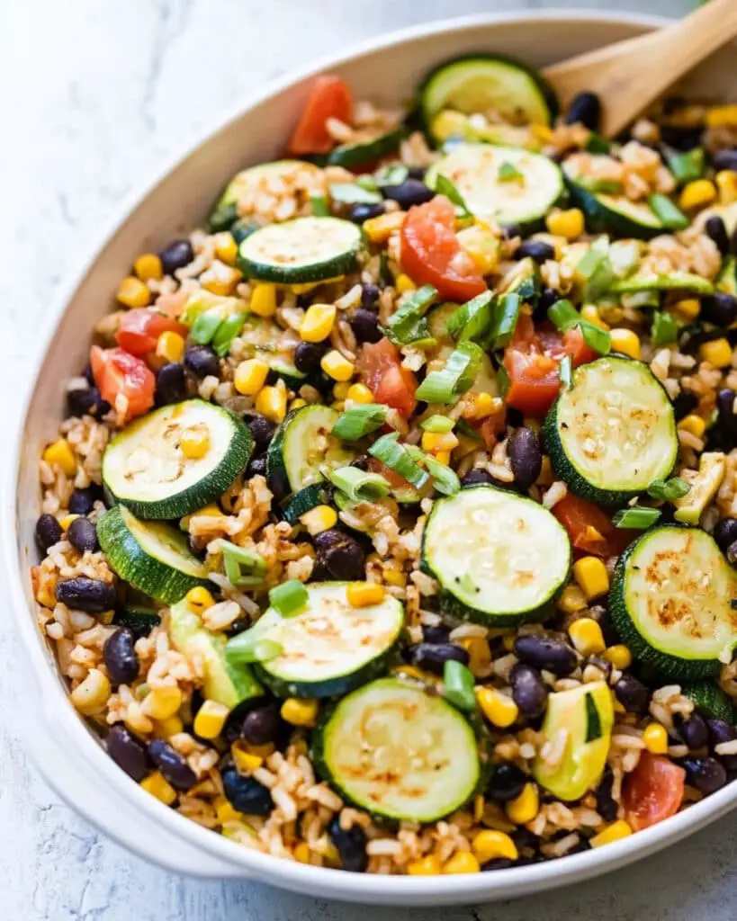 Tex Mex Rice and Beans with Zucchini is a vibrant, one-pot vegetarian main course packed with brown rice, hearty black beans, sweet corn, and fresh zucchini, all seasoned with a blend of taco spices and tomatoes for a flavorful, nutritious, and satisfying meal.