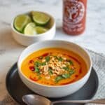 Ladle the soup into bowls, then drizzle with Sriracha for a little extra heat. I love topping it with sliced scallions, chopped salted peanuts, and fresh cilantro—it adds such a wonderful fresh crunch and brightness that contrast beautifully with the silky soup.