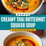 This Thai-Inspired Butternut Squash Soup with Coconut Milk is a comforting and flavorful dish featuring tender butternut squash and carrots simmered in a fragrant broth infused with garlic, ginger, and Thai red curry paste. Finished with creamy coconut milk, a splash of lime juice, and topped with crunchy peanuts, scallions, and fresh cilantro, this soup delivers a perfect balance of sweet, spicy, and savory flavors ideal for a cozy meal.