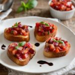 This Easy Tomato and Bacon Bruschetta is a delicious and quick appetizer featuring toasted French baguette slices topped with a flavorful mix of fresh cherry tomatoes, red onion, basil, and crispy bacon. Finished with a drizzle of balsamic glaze, it’s perfect for gatherings or a simple snack.
