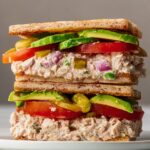 - Assemble the Sandwiches: Spread the spicy pesto aioli evenly over the toasted side of each bread slice. Divide and spread the prepared tuna mixture across two slices of bread. Layer each with two slices of tomato and sliced avocado to your liking. Top with pickled banana peppers for a spicy, briny punch if desired.