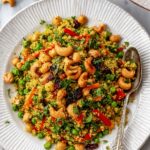This Vibrant Curry Cashew Chickpea Quinoa Salad is a flavorful and nutritious dish combining fluffy quinoa cooked with aromatic spices, protein-rich chickpeas, fresh vegetables, and sweet-tart dried cherries. Toasted maple cayenne cashews add a tantalizing crunch and a spicy-sweet kick, making this salad perfect for a wholesome main meal or a delightful side dish.