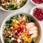 A vibrant and refreshing Winter Salad featuring a mix of kale, spring greens, shredded cabbage, carrots, tart apples, candied nuts, goat cheese, and pomegranate arils, all tossed in a tangy homemade red wine vinegar dressing. Perfect for a healthy, colorful seasonal meal or side dish.